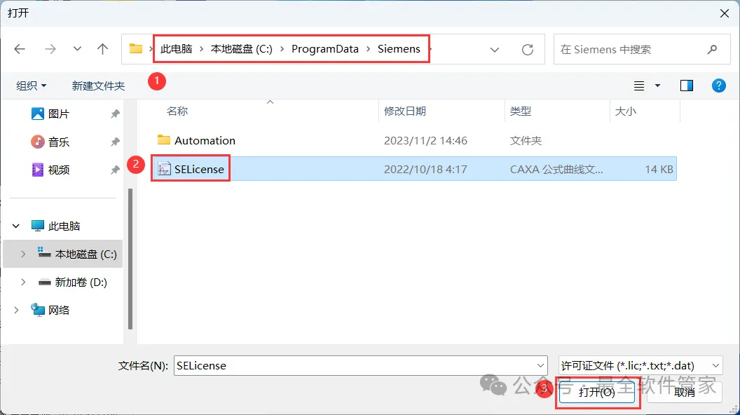 26、找到并选中路径:C:\ProgramData\Siemens文件夹下的【SELicense】文件,再点击【打开】