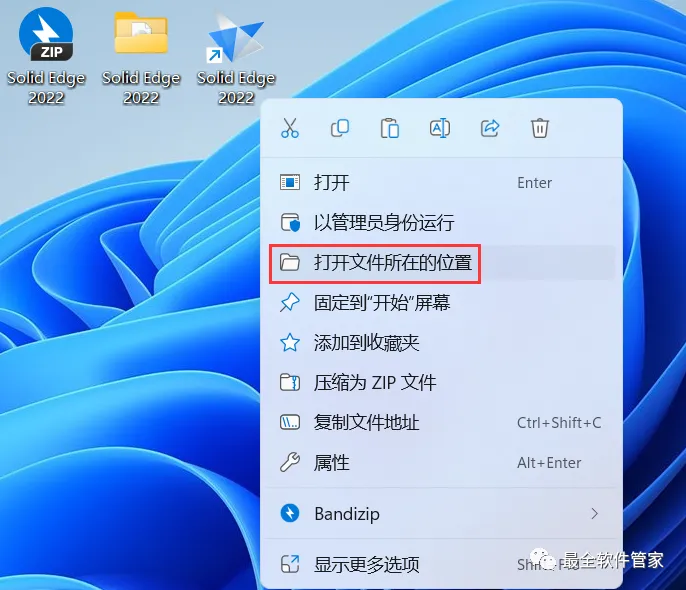 10、回到桌面,右键桌面上的【Solid Edge 2022软件图标】,点击【打开文件所在的位置】