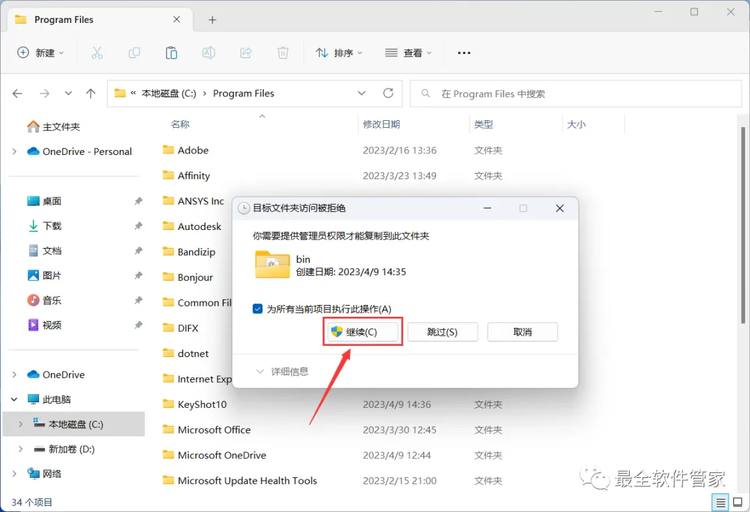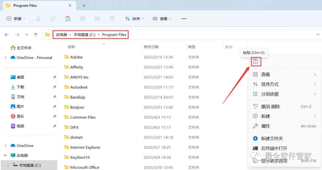 14、打开路径:C:\Program Files,再右键文件夹的空白处,点击【粘贴按钮】