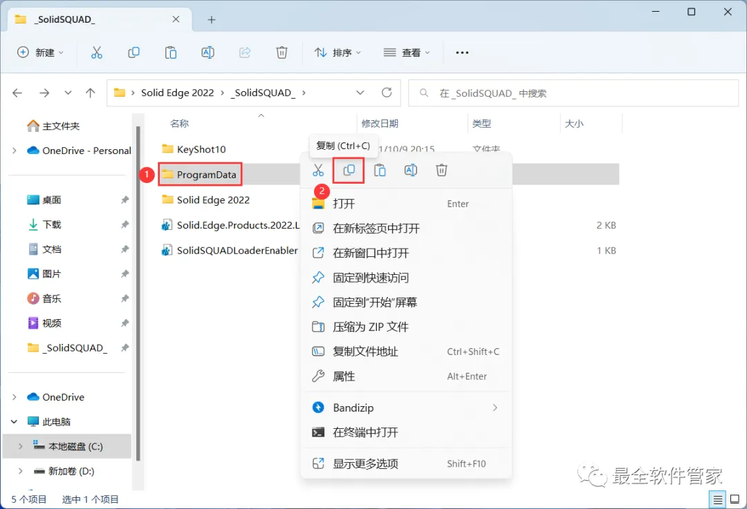 16、回到Solid Edge 2022文件夹的_SolidSQUAD_】文件夹,找到【ProgramData】文件夹,再右键点击【复制按钮】