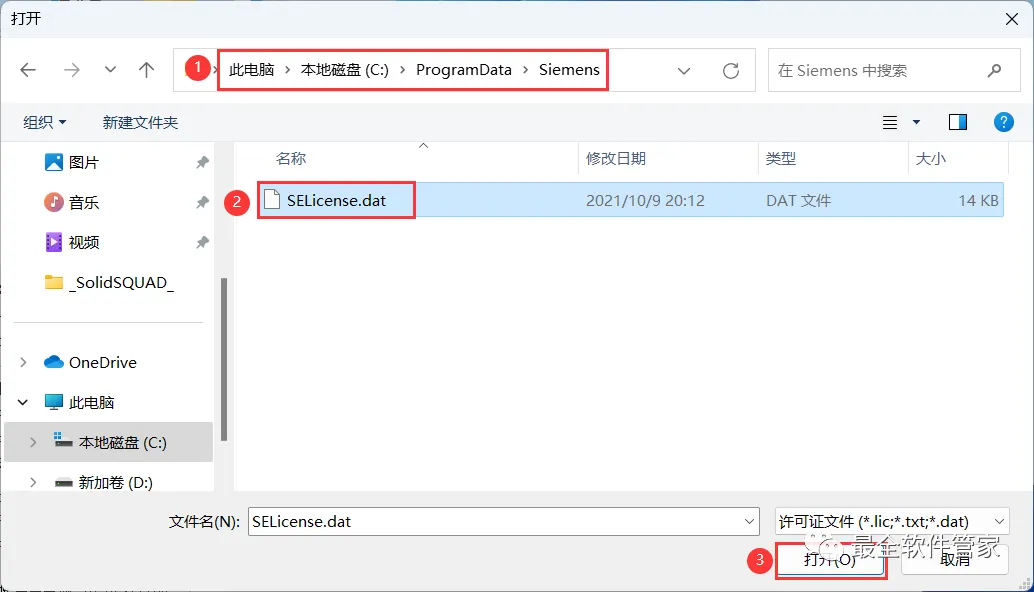 27、找到并选中路径:C:\ProgramData\Siemens的【SELicense.dat】文件,再点击【打开】