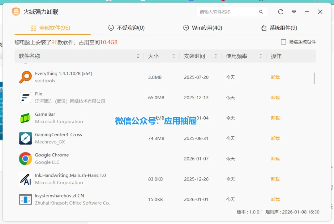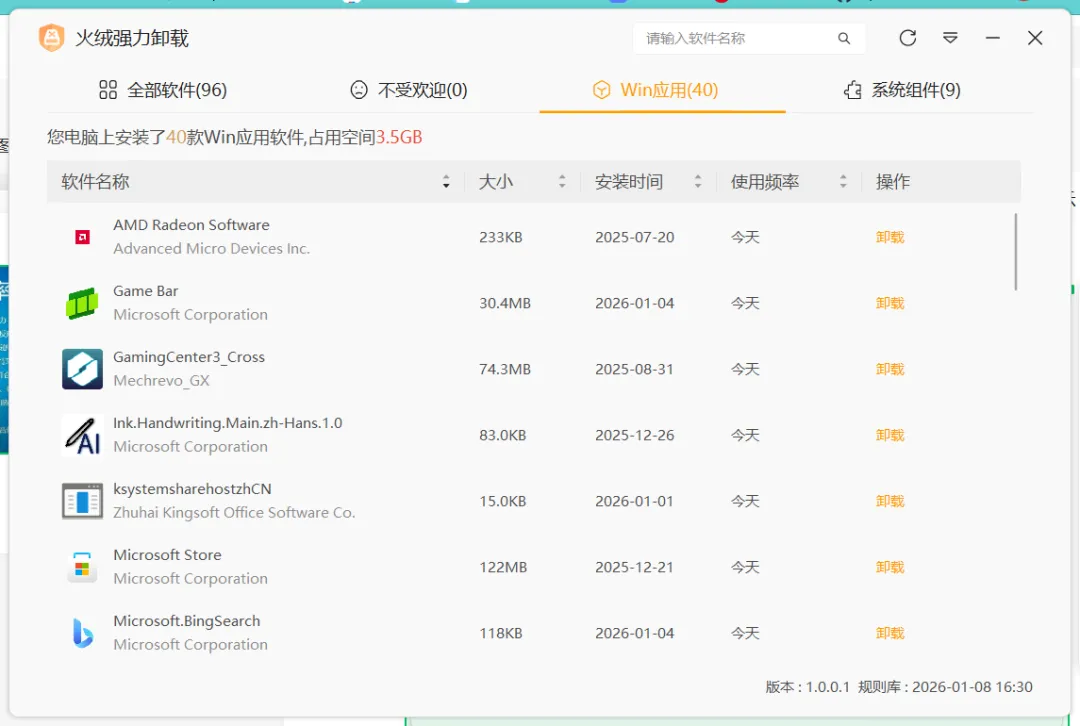 支持软件按“全部/不受欢迎/Win应用/系统组件”多维度分类,同时展示软件大小、安装时间、使用频率,方便快速定位目标软件。