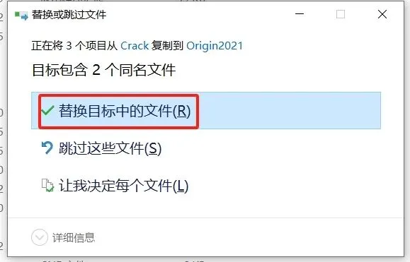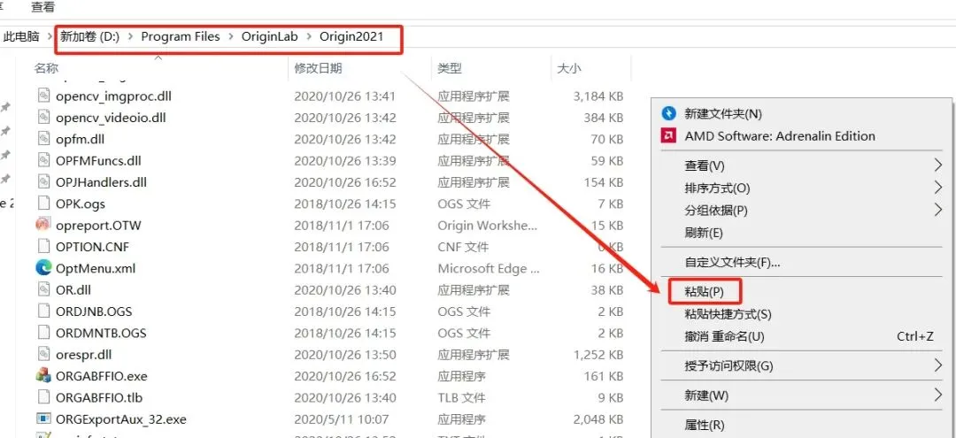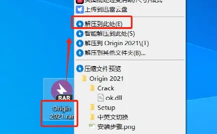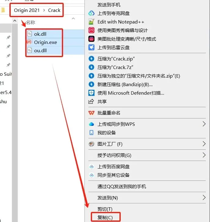 17.进入解压后的【Origin 2021】-【Crack】文件夹,选中全部文件,鼠标右键,选择【复制】。