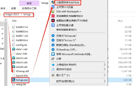 2.进入解压后的【Origin 2021】-【Setup】文件夹,选择【setup.exe】,鼠标右键,选择【以管理员身份运行】。