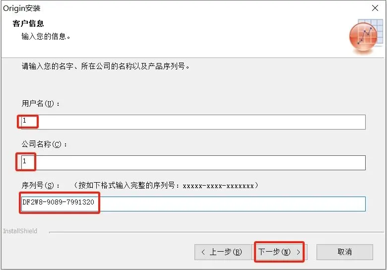 6.【用户名】和【公司名称】随意输入,序列号输入【DF2W8-9089-7991320】,点击【下一步】。