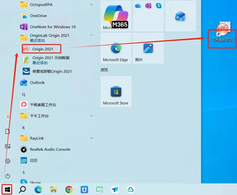 16.点击【开始图标】,找到【Origin 2021】图标,拖到桌面。