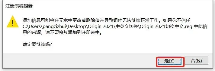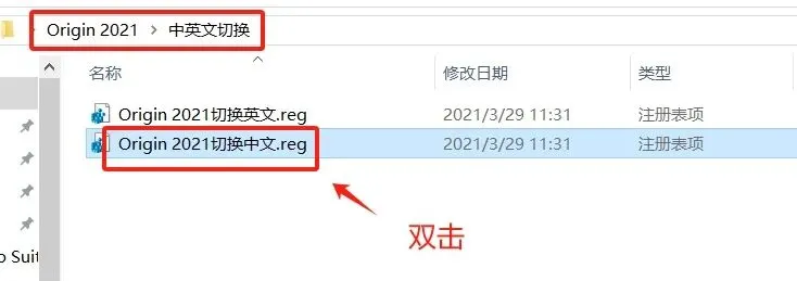 21.进入解压后的【Origin 2021】-【中英文切换】文件夹,选择【Origin 2021切换中文.reg】,双击。