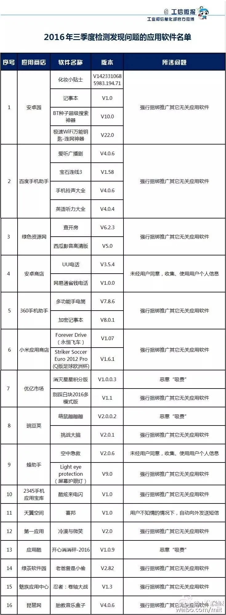工信部今天通报了2016年第三季度手机应用软件检测报告,发现29款存在不同违规行为。