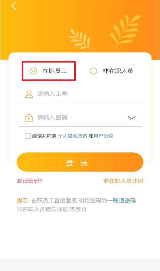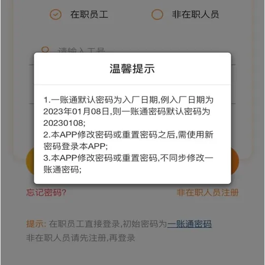 (在职员工直接使用一账通登录,初始密码是入厂日期(转正日期),若忘记密码请看下一步)