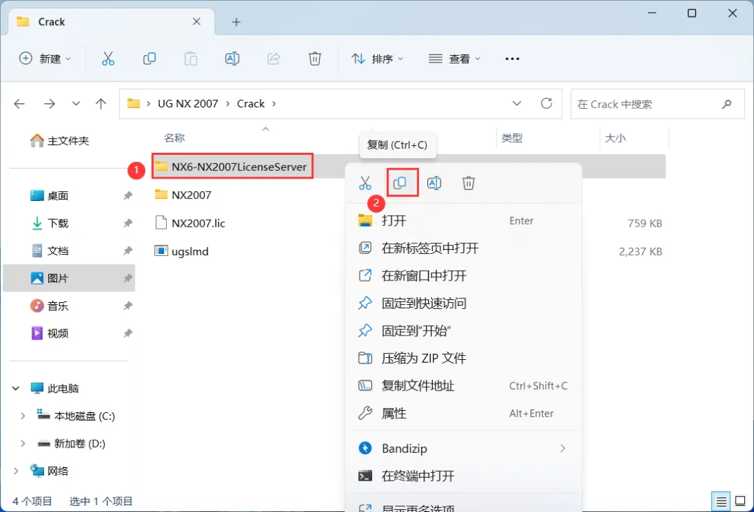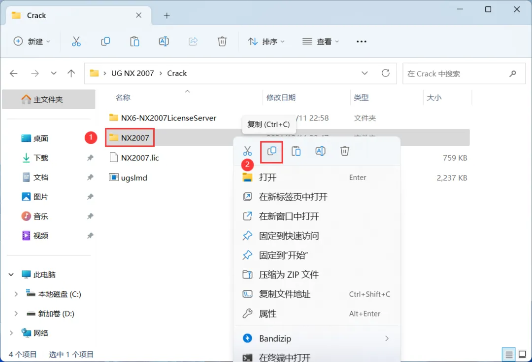 24、回到Crack文件夹,找到【NX2007】文件夹,右键点击【复制按钮】