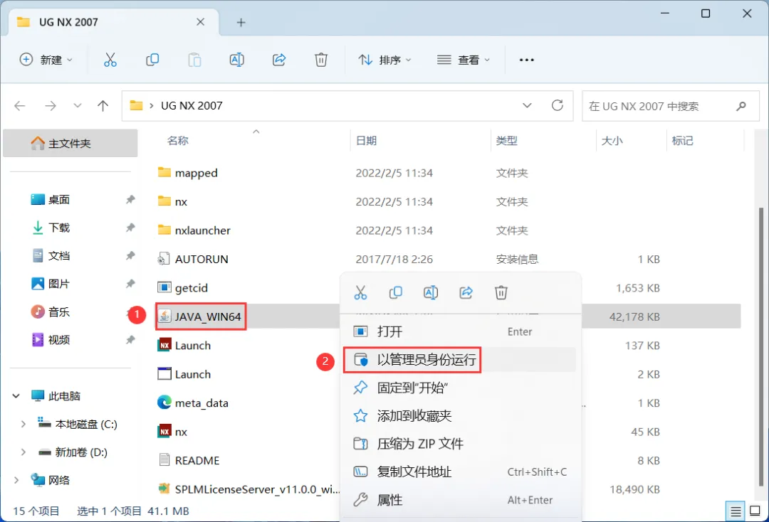 9、回到UG NX 2027文件夹,找到【JAVA_WIN64】应用程序,右键选择【以管理员身份运行】它