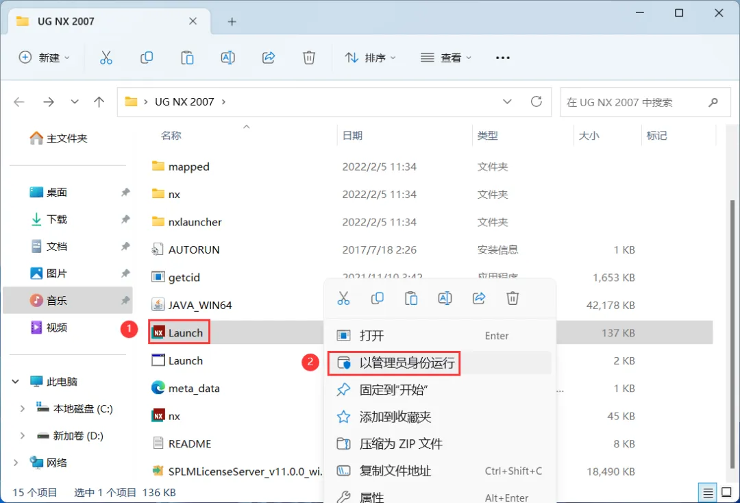 13、回到UG NX 2007文件夹,找到【Launch】应用程序,右键选择【以管理员身份运行】它