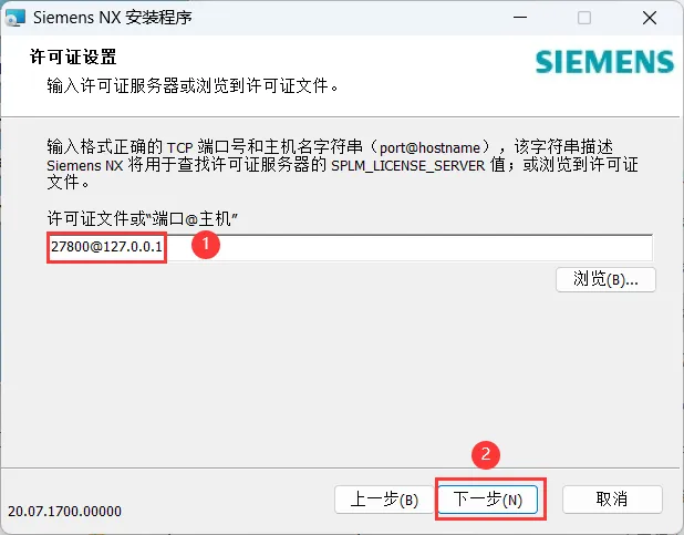 18、许可证文件输入:27800@127.0.0.1,再点击【下一步】