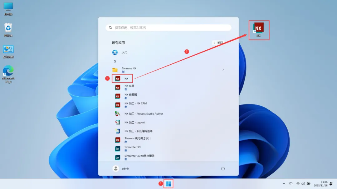 25、回到桌面,点击任务栏的【开始菜单】,在【所有应用】中找到【NX软件图标】,将软件图标拖到桌面上,完成软件桌面快捷方式的创建