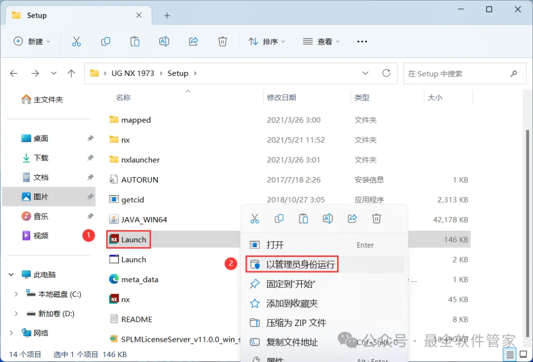 13、回到Setup文件夹,找到【Launch】应用程序,右键选择【以管理员身份运行】它
