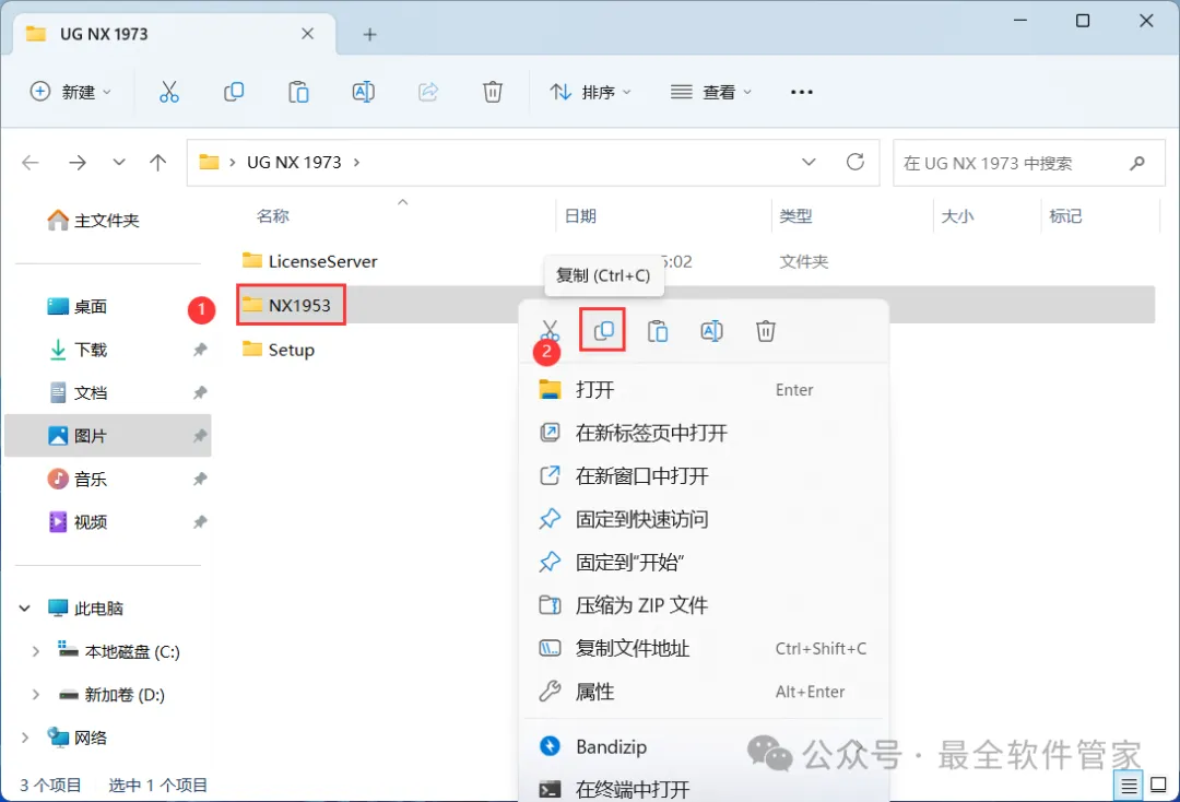 24、回到UG NX 1973文件夹,找到【NX1953】文件夹,右键点击【复制按钮】
