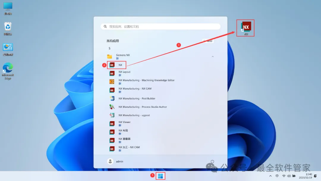 25、回到桌面,点击任务栏的【开始菜单】,在【所有应用】中找到【NX软件图标】,将软件图标拖到桌面上,完成软件桌面快捷方式的创建
