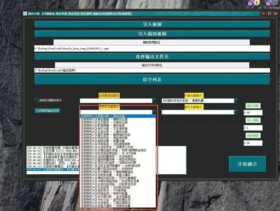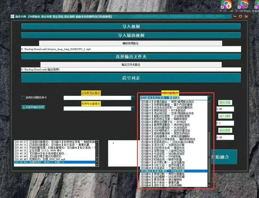 工具内置了“全场景混合模式”和“视频去重模式”,用户可根据需求灵活切换。更重要的是,它提供了多达45种针对抖音平台的专属去重策略。