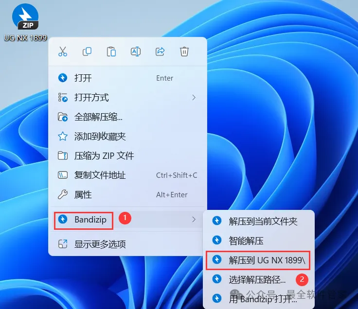 1、下载UG NX 1899软件安装包到电脑上,右键选择【解压到UG NX 1899\】
