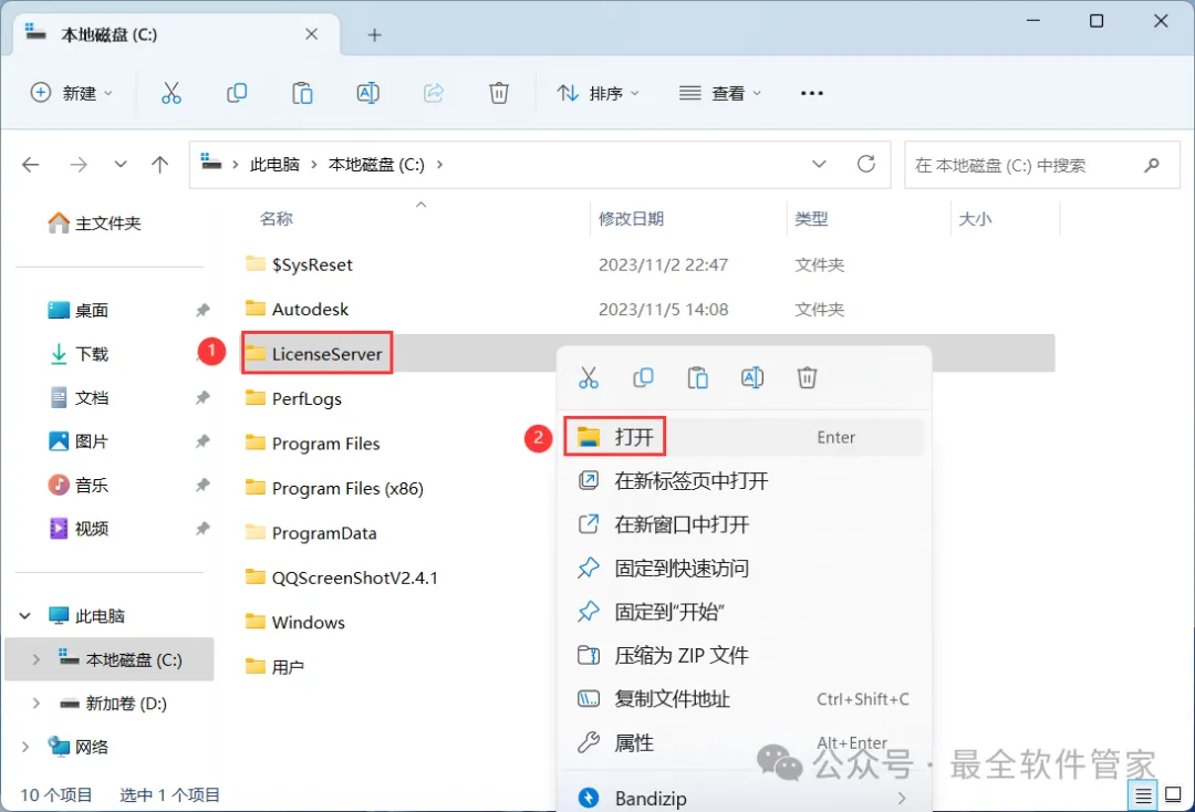 5、找到粘贴的【LicenseServer】文件夹,再右键【打开】它