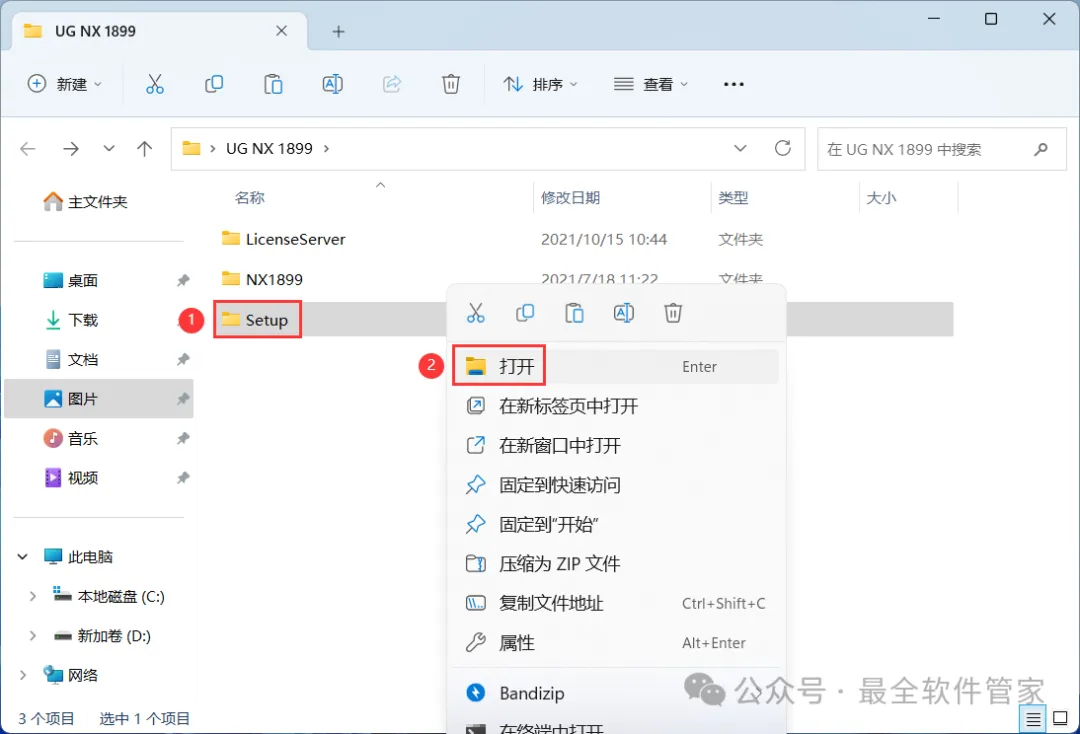 8、回到UG NX 1899文件夹,找到【Setup】文件夹,右键【打开】它