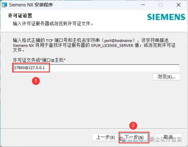 21、许可证文件输入:27800@127.0.0.1,再点击【下一步】