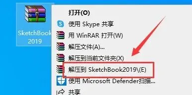 1.选中下载的【SketchBook2019】压缩包,鼠标右击选择【解压到SketchBook2019】。