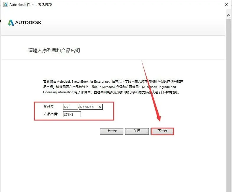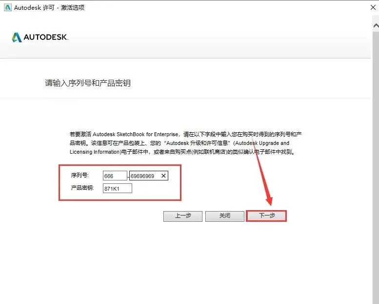 13.输入序列号:【666-69696969】与产品密钥:【871K1】,然后点击【下一步】。