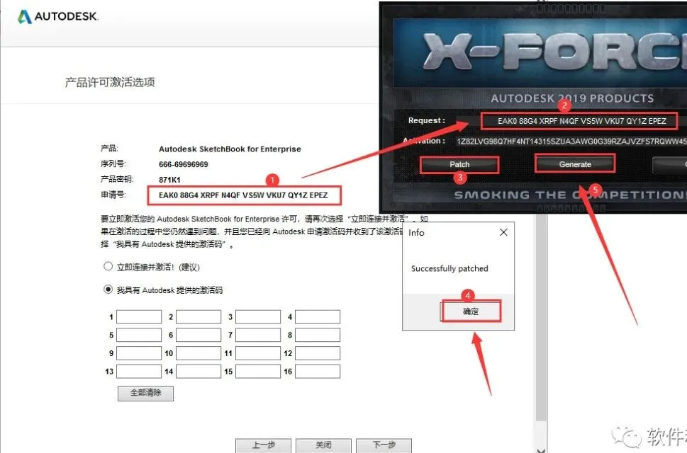 19.①使用快捷键“Ctrl+C”复制【申请号】;②使用快捷键“Ctrl+V”将代码粘贴到【Request】后的框中(记得删除原框中内容);③点击【Patch】;④点击【确定】;⑤点击【Generate】生成激活码。