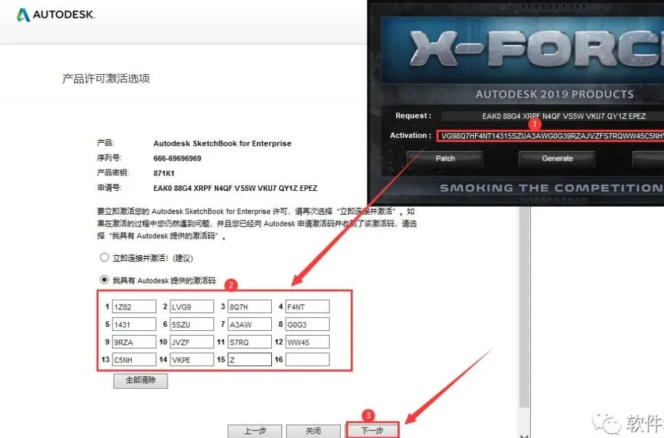 20.①使用快捷键“Ctrl+C”复制【Activation】后框中的激活码;②使用快捷键“Ctrl+V”将激活码粘贴到【激活码输入框】中;③点击【下一步】。