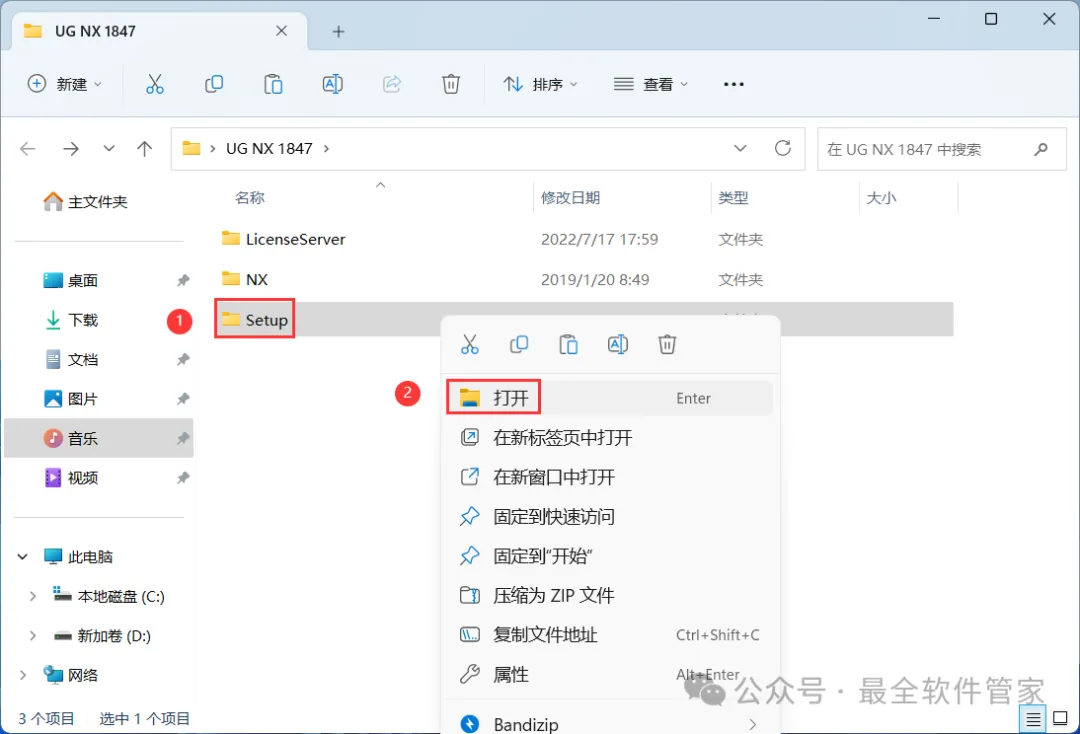8、回到UG NX 1847文件夹,找到【Setup】文件夹,右键【打开】它