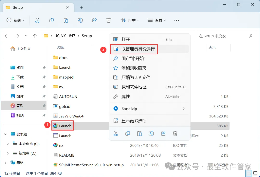 16、回到Setup文件夹,找到【Launch】应用程序,右键选择【以管理员身份运行】它