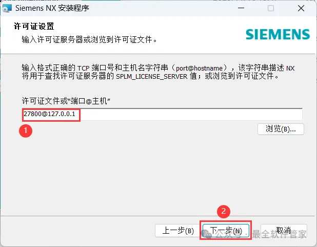 21、许可证文件输入:27800@127.0.0.1,再点击【下一步】