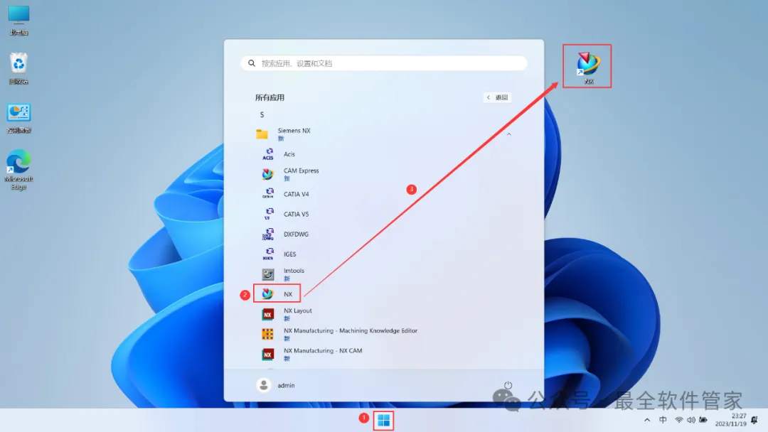 28、回到桌面,点击任务栏的【开始菜单】,在【所有应用】中找到【NX软件图标】,将软件图标拖到桌面上,完成软件桌面快捷方式的创建