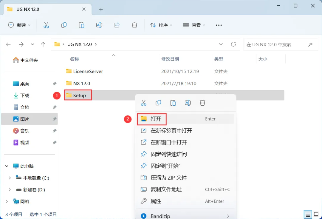 8、回到UG NX 12.0文件夹,找到【Setup】文件夹,右键【打开】它
