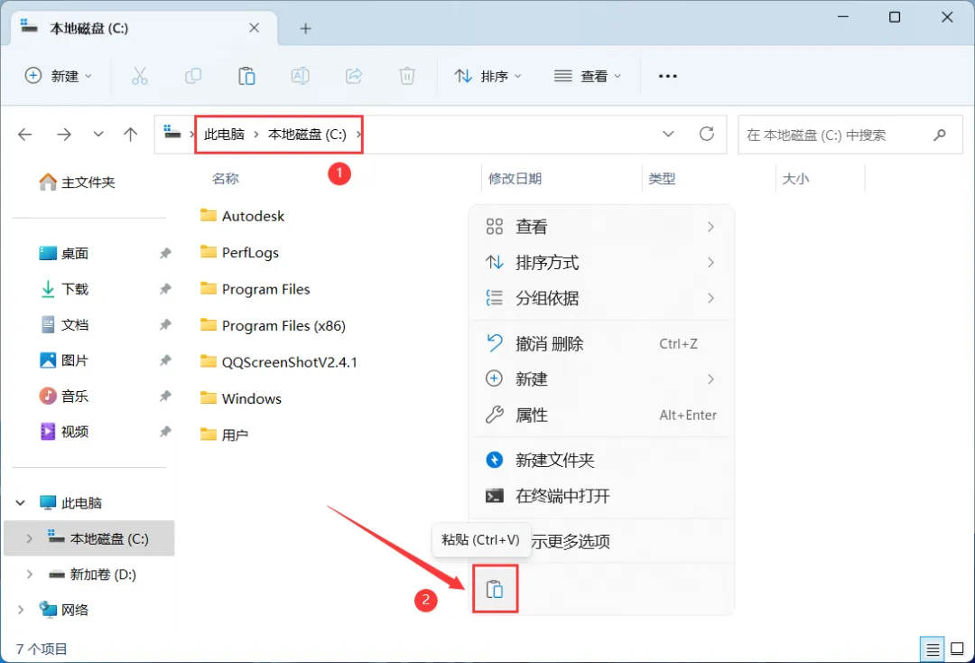 4、打开本地磁盘C,再右键文件夹的空白处,点击【粘贴按钮】