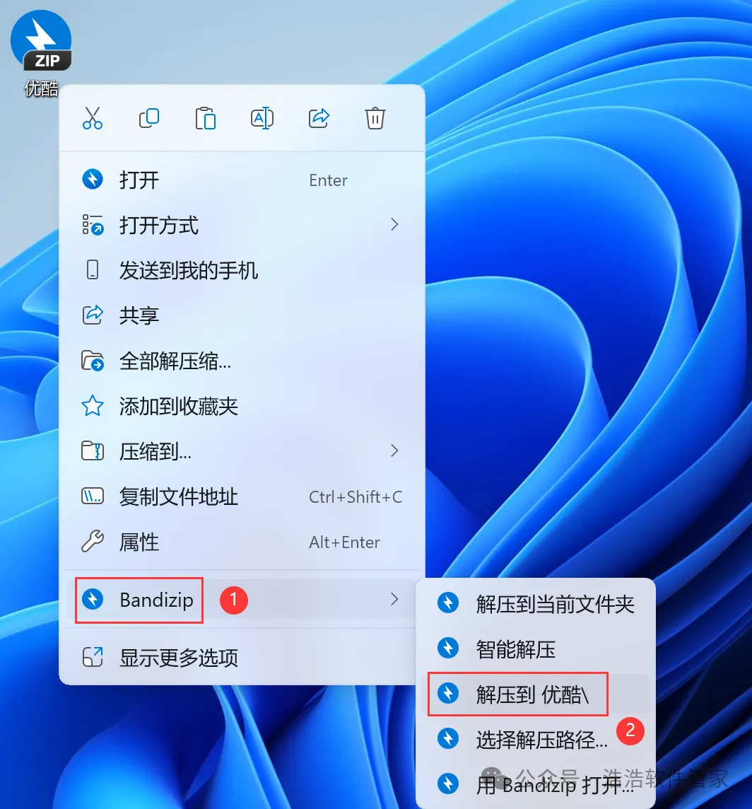 1、下载优酷软件安装包到电脑上,右键选择【解压到优酷\】