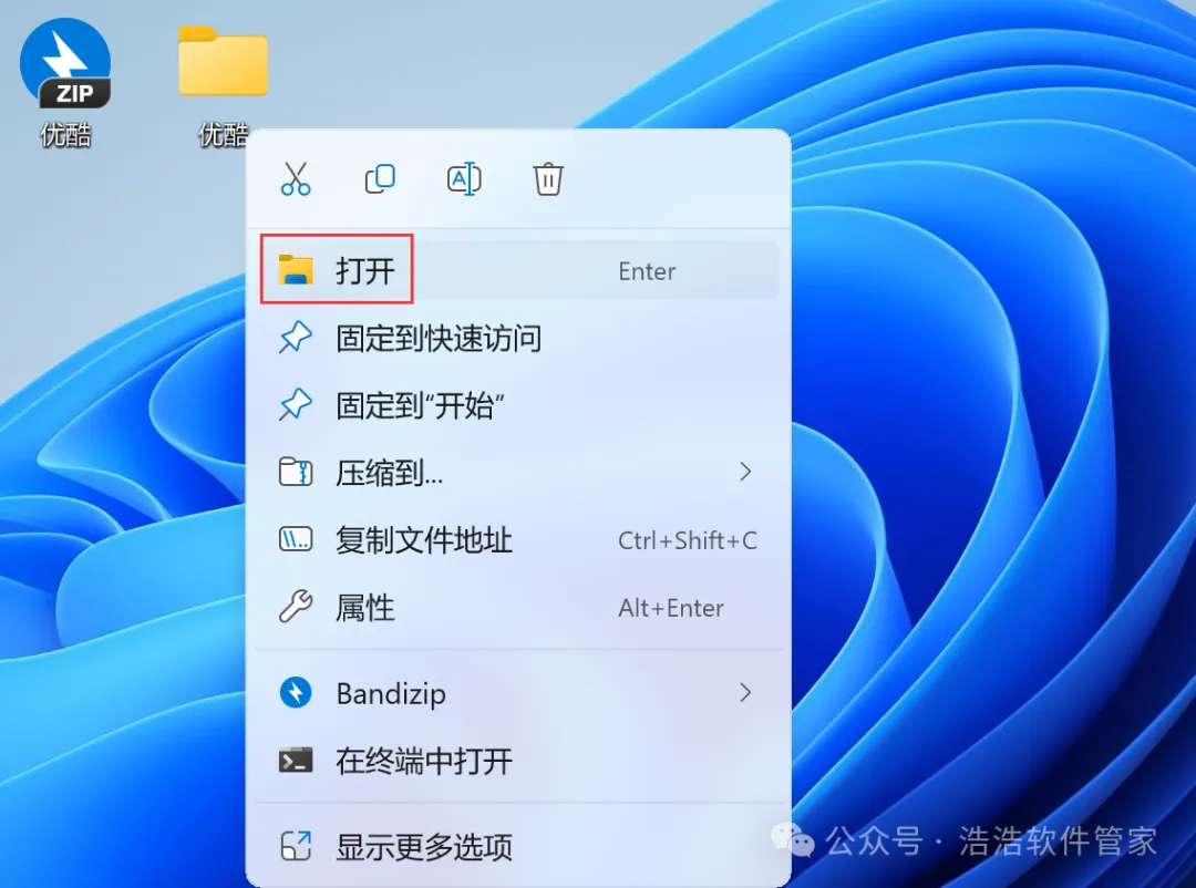 8、回到桌面,右键桌面上的【优酷软件图标】,点击【打开】