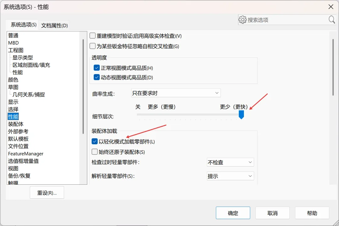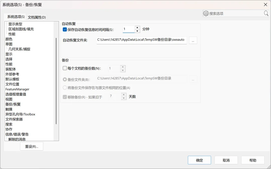solidworks下载后,设置没有调好,对于我们画图是有很大的影响的。接下来,就是solidworks的设置优化讲解。点击solidworks的设置图标就能进入以下界面。 第一,在草图选项,我们一定要勾选第一项“在创建草图以及编辑草图时自动旋转视图以垂直于草图基准面(A)”。比如我们在某一个面上编辑,如果不勾选,这个面就不会自动旋转到平行电脑界面,这严重影响我们的操作过程。所以这个选项是必须要勾选的。 第二,在性能选项。性能较好的电脑在“细节层次”可以选择“更多(更慢)”,电脑性能相对差点选择“更少(更快)”和勾选“以轻化模式加载零件部件(L)”。后期,我们的零件会越来越复杂,装配体体量较大,电脑容易出现卡顿的现象,则“以轻化模式加载零件部件(L)”选项则有必要勾选。 第三,在装配体选项,我们根据自己电脑性能调节这个数值的大小。原因与第二个设置原因一样,装配体体量大的时候,对电脑性能是非常讲究的,过大,电脑容易卡顿,甚至加载不出来。有必要调节这个数值。 第四,视图选项。如下图,这几个选择快慢也是根据电脑性能选择的。快表示你要编辑的面旋转到与电脑界面平行的快慢。我个人是喜欢快一些,这样效率会高一些。 第五,在“备份/恢复”选项,勾选“保存自动回复信息时间间隔”,时间间隔根据自己情况设置,建议10分钟。这样有效防止意外崩溃导致的文件丢失同时可以减少后台资源占用。