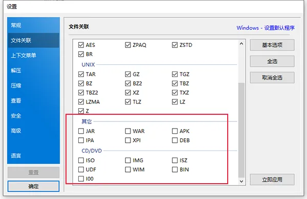 3、安装完成后,软件会自动弹出设置界面,其中文件关联界面中,默认是开启所有压缩包、Unix文件的,但其他如jar、apk以及CD/DVD等文件需要用户自行勾选开启