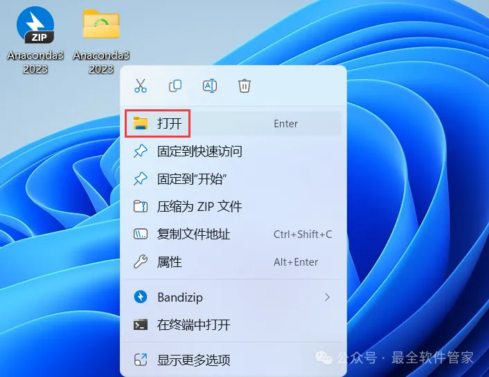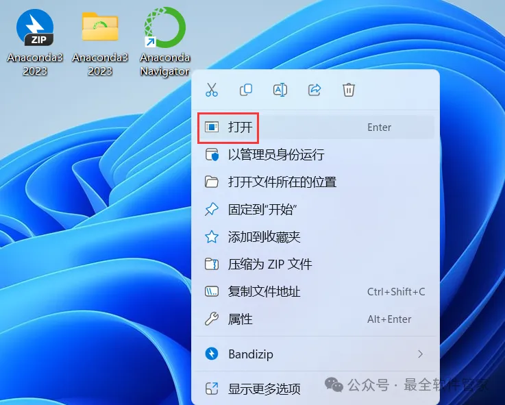 14、右键桌面上的【Anaconda3软件图标】,点击【打开】