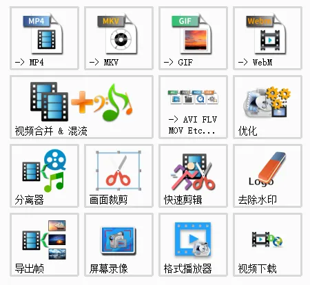 视频格式转换:转为mp4、转为mkv、转为GIF、转为Webm、屏幕录像、视频下载、视频合并、画面裁剪、去水印等功能。