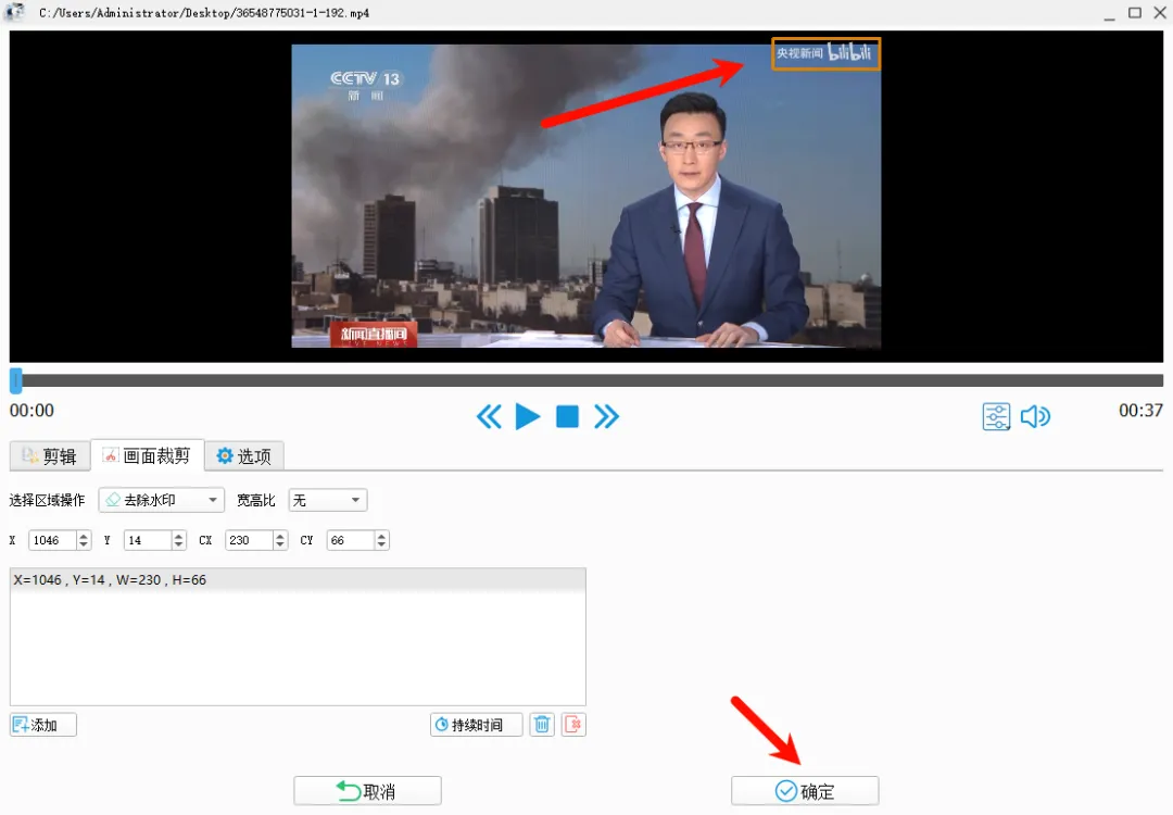 选择需要去水印的视频后,然后框选需要去除水印的区域,然后点“确定”。