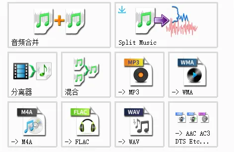 音频格式转换:音频合并、Split Music、分离器、混合、转为MP3、转为WMA、转为M4A、转为FLAC、转为WAV等功能。