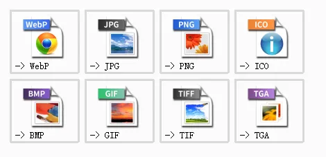 转为Webp、转为JPG、转为PNG、转为IOC、转为BMP、转为GIF、转为TIF、转为TGA。
