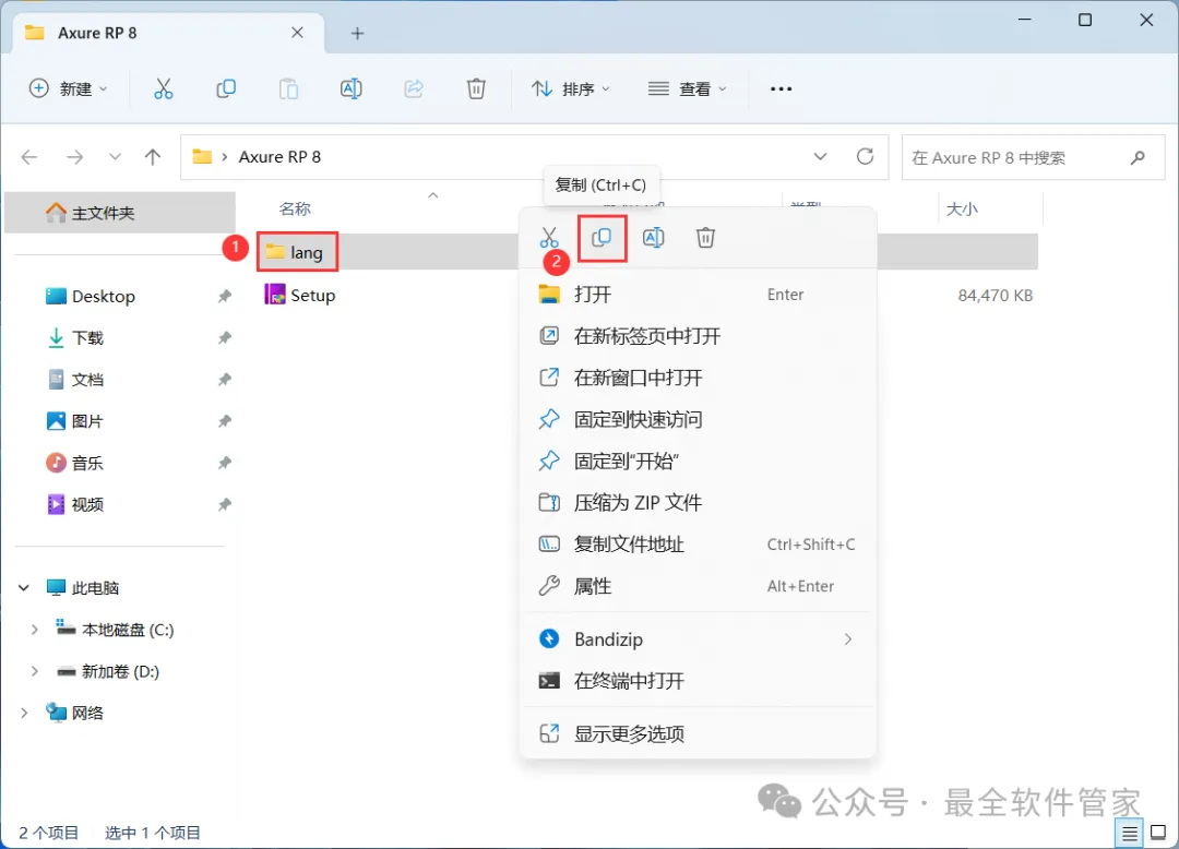 11、回到Axure RP 8文件夹,找到【lang】文件夹,再右键点击【复制按钮】