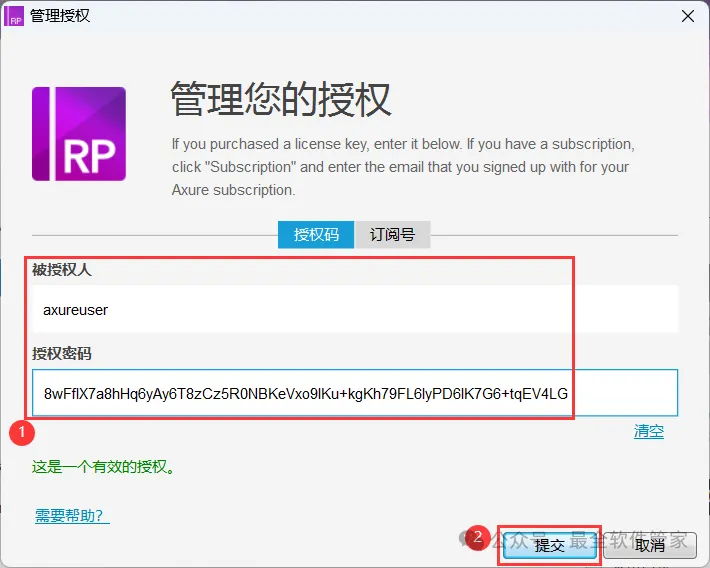 17、被授权人输入:axureuser,授权密码输入:8wFfIX7a8hHq6yAy6T8zCz5R0NBKeVxo9IKu+kgKh79FL6IyPD6lK7G6+tqEV4LG,再点击【提交】