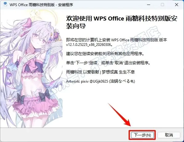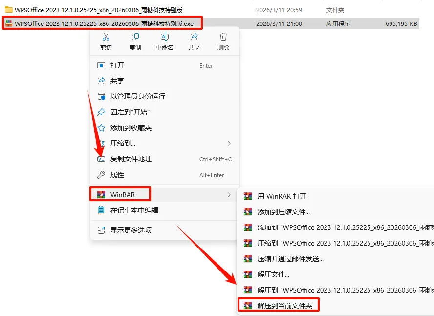 2.打开刚刚解压的文件夹,鼠标右键点击“WPSOffice_雨糖科技特别版_2023_12.1.0.25225_x86_20260306.exe”选择“以管理员身份运行”