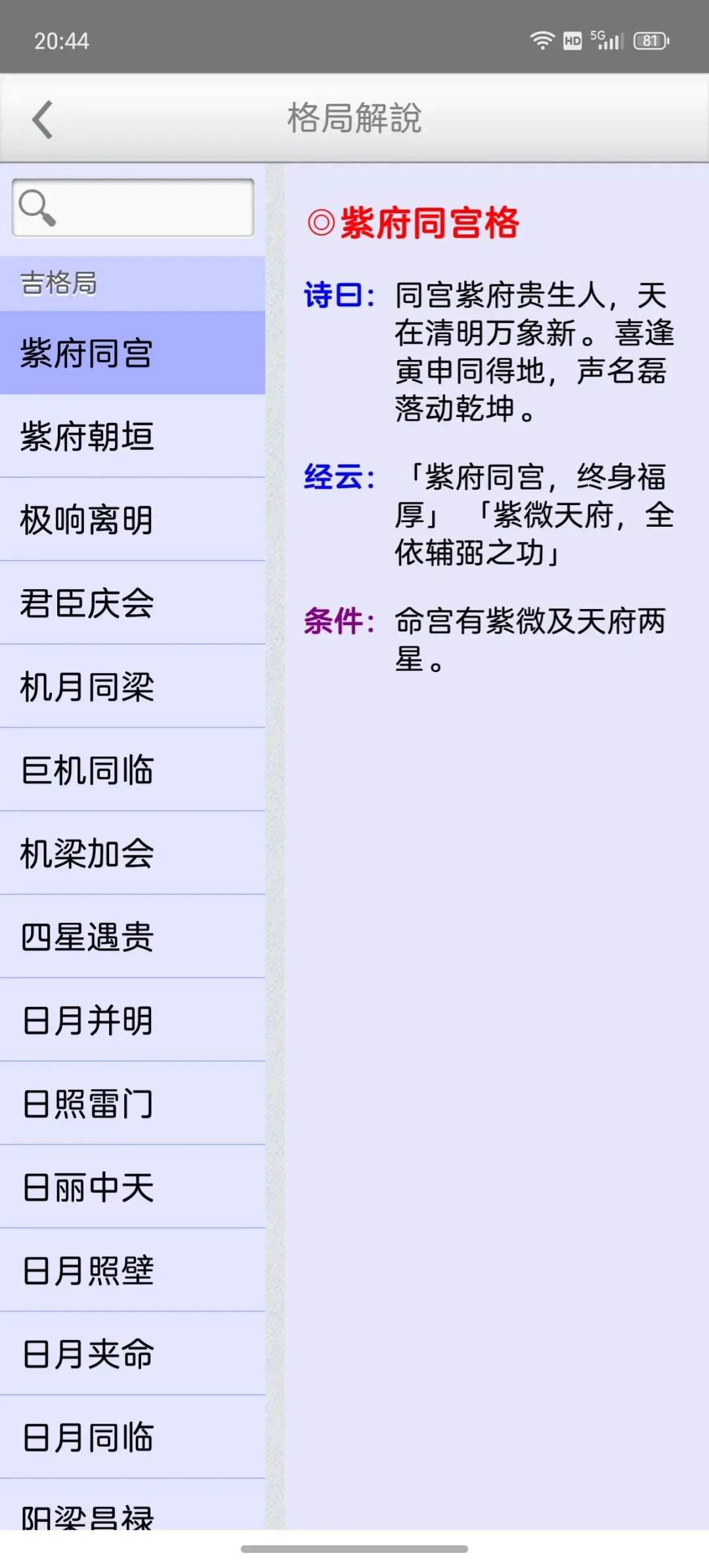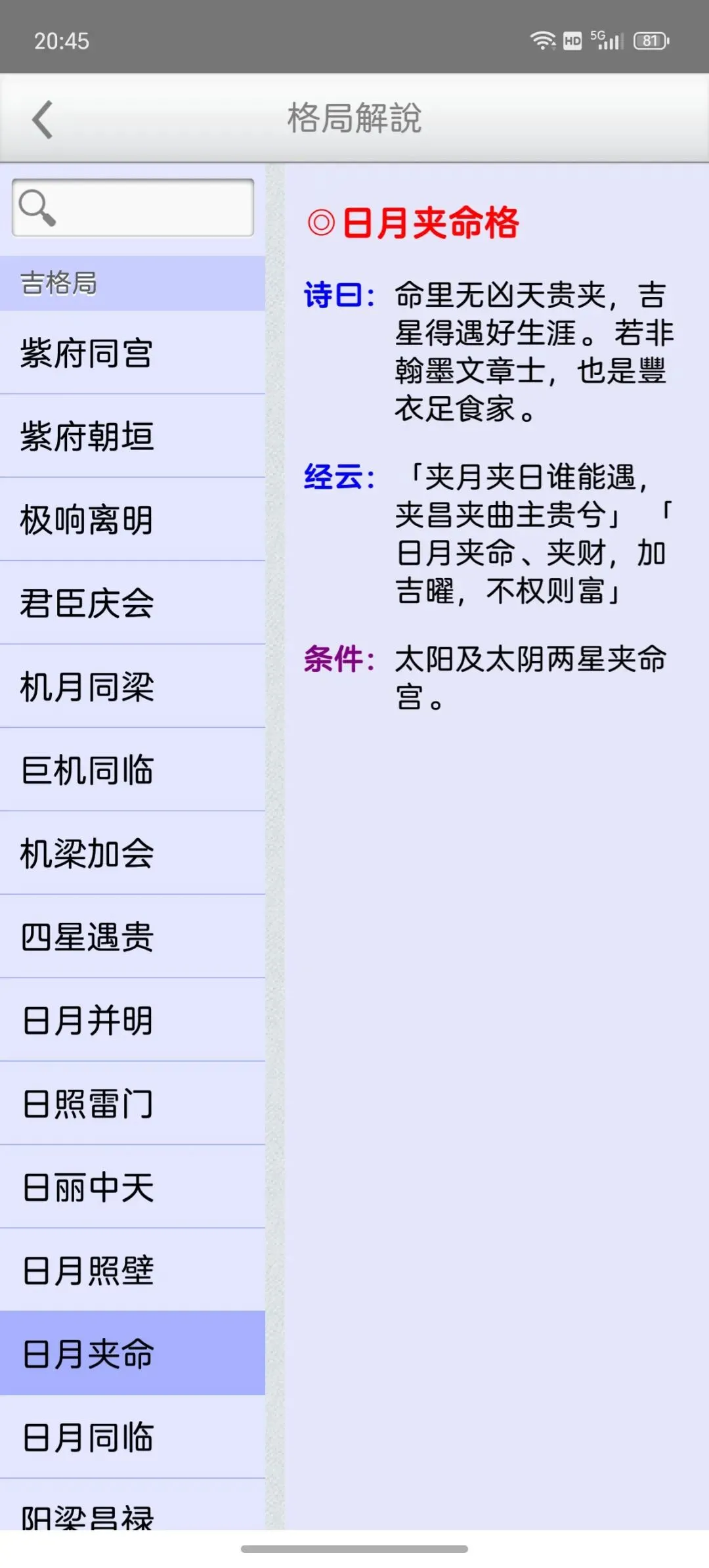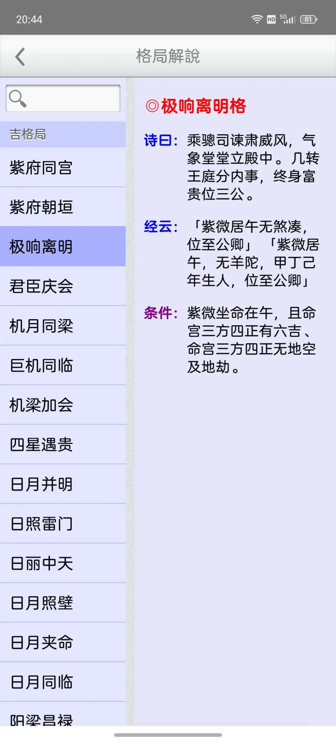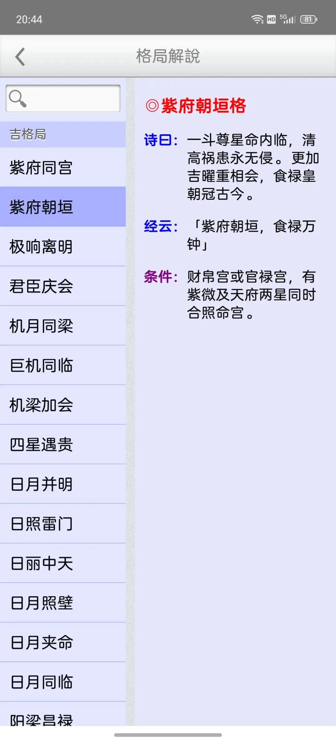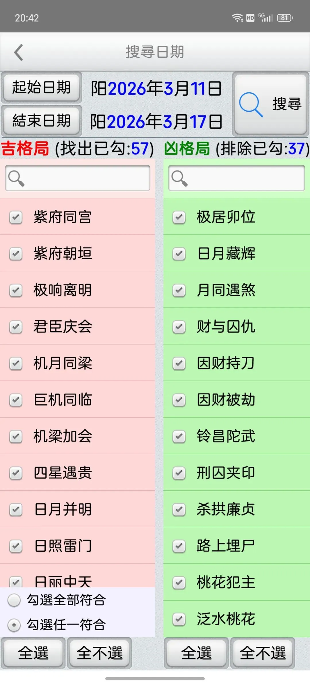 这是一个能在一个日期范围内,快速的找到最佳的剖复生产日期(优生择吉)筛选工具,它可以在每一天的每一个时辰,依指定条件,来搜寻想要的格局组合,更多功能如下:优生择吉:指定起始日期~结束日期之范围,并可选择下列搜寻条件:选取搜寻符合紫微「57 个吉格局」(可复选)选取搜寻排除紫微「37 个凶格局」(可复选)吉格局条件,可选择「勾选全部符合」或「勾选任一符合」搜寻到的日期列表内,会提示日期符合的项目。月历命盘格局:月历:可上下滑动来调整月份。提供直接输入「阳历、农历、干支」来显示内容。提供快速调整日期「加/减月,加/减日,加/减时」功能。显示内容包括:紫微命盘、格局古文解说、格局成立条件。偏好设定:週首日:设定一週开始的星期。历法:提供夜子时、闰月等设定。语言地区:可随时切换介面语言,提供繁体中文、简体中文。介面字型:提供字型大小调整。萤幕锁定:不锁定可长时间使用,萤幕不会关闭。★ 万年历提供:西元 1600 ~ 2200 年。★ 操作介面:繁体中文、简体中文。★ 同时支援平板大萤幕任意方向显示。