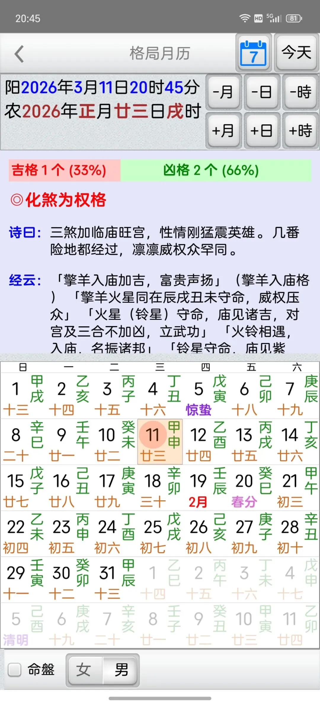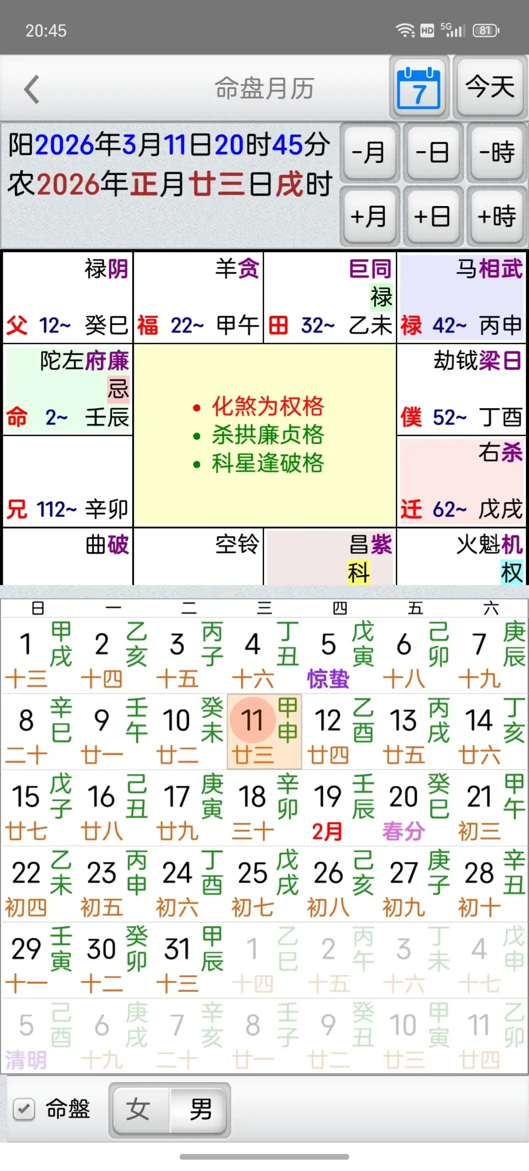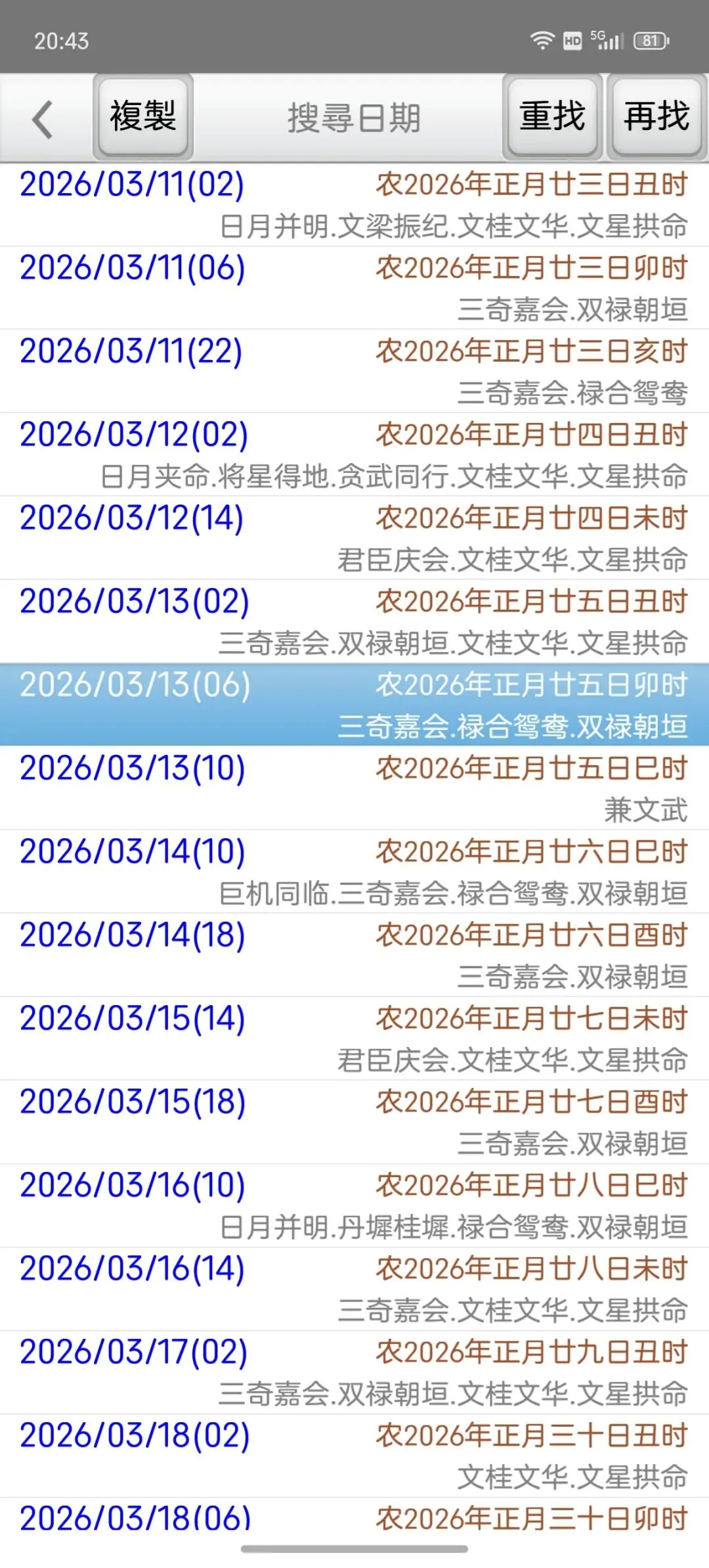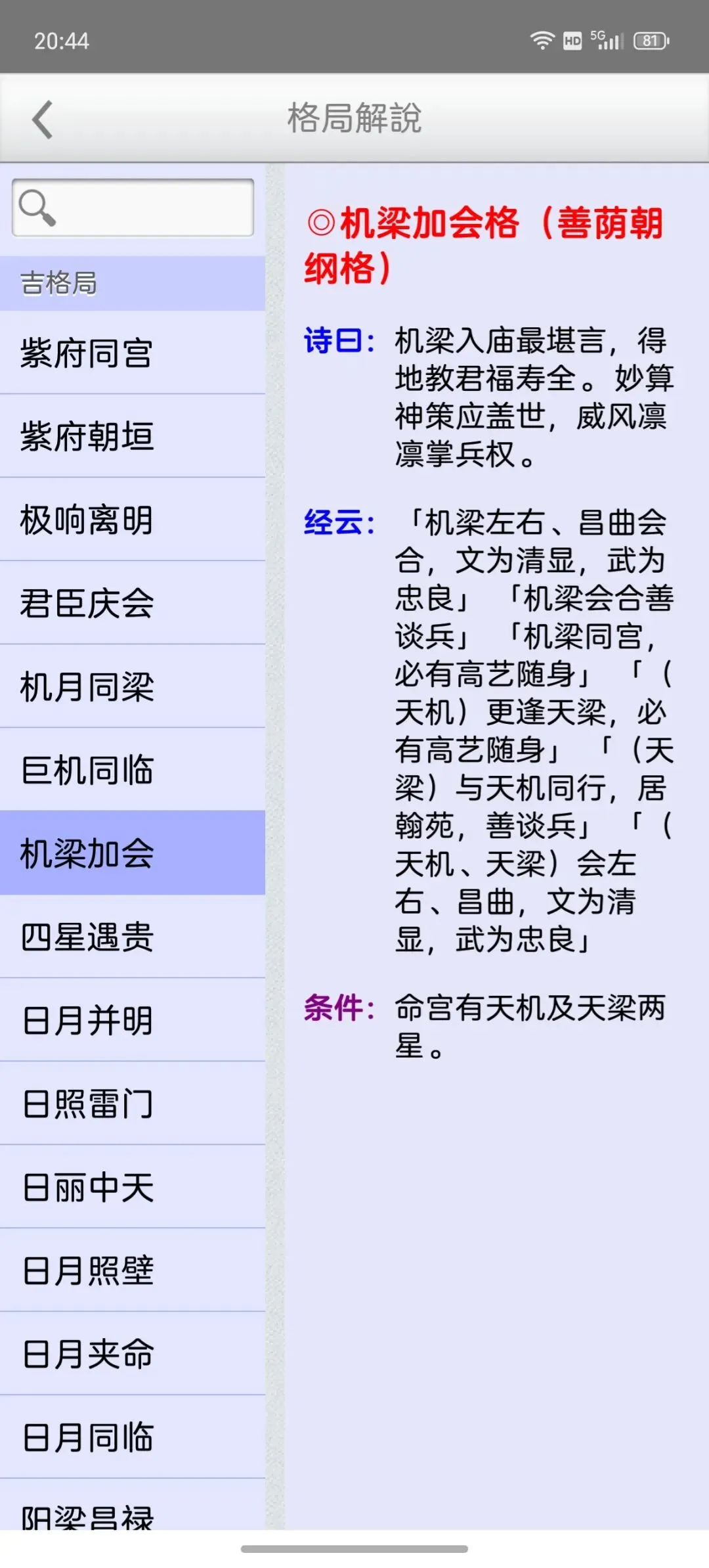 这是一个能在一个日期范围内,快速的找到最佳的剖复生产日期(优生择吉)筛选工具,它可以在每一天的每一个时辰,依指定条件,来搜寻想要的格局组合,更多功能如下:优生择吉:指定起始日期~结束日期之范围,并可选择下列搜寻条件:选取搜寻符合紫微「57 个吉格局」(可复选)选取搜寻排除紫微「37 个凶格局」(可复选)吉格局条件,可选择「勾选全部符合」或「勾选任一符合」搜寻到的日期列表内,会提示日期符合的项目。月历命盘格局:月历:可上下滑动来调整月份。提供直接输入「阳历、农历、干支」来显示内容。提供快速调整日期「加/减月,加/减日,加/减时」功能。显示内容包括:紫微命盘、格局古文解说、格局成立条件。偏好设定:週首日:设定一週开始的星期。历法:提供夜子时、闰月等设定。语言地区:可随时切换介面语言,提供繁体中文、简体中文。介面字型:提供字型大小调整。萤幕锁定:不锁定可长时间使用,萤幕不会关闭。★ 万年历提供:西元 1600 ~ 2200 年。★ 操作介面:繁体中文、简体中文。★ 同时支援平板大萤幕任意方向显示。
